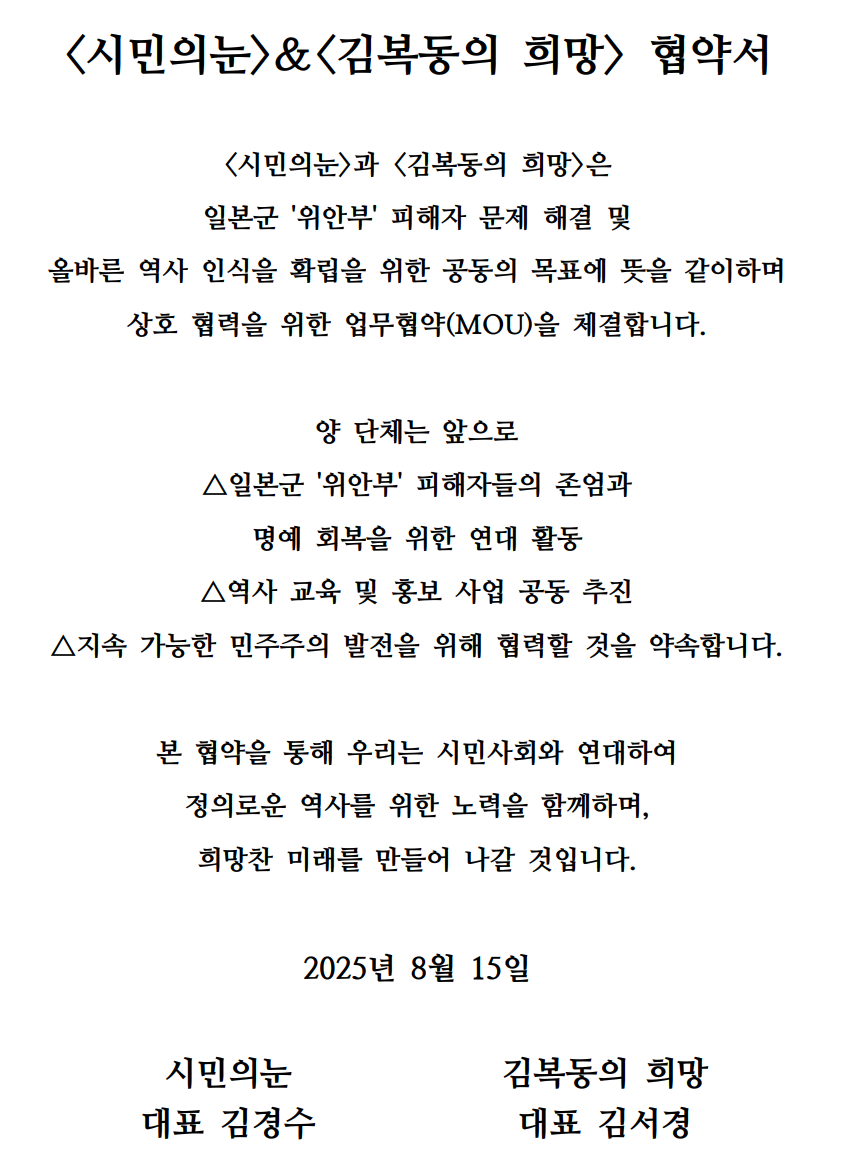 <시민의눈>(대표 김경수)과 <김복동의 희망>(대표 김서경)은 2025년 8월 15일, 상호 협력을 위한 업무협약(MOU)을 체결하고 시민사회와의 연대를 통해 희망찬 미래를 함께 만들어 나가기로 약속했다.